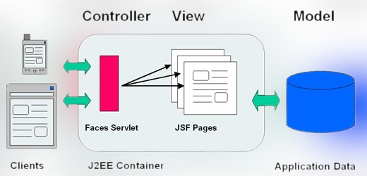 L'une des principales avantages de JSF est qu'il est à la fois une norme d'interface utilisateur Web Java et un framework qui suit fermement le modèle de conception Modèle-Vue-Contrôleur (MVC). Cela rend les applications JSF beaucoup plus faciles à gérer car le code de l'interface utilisateur (Vue) est clairement séparé des données et de la logique de l'application (Modèle). Pour préparer le contexte JSF, qui fournit l'accès aux données de l'application aux pages et pour protéger contre l'accès non autorisé ou inapproprié des pages, toutes les interactions de l'utilisateur avec l'application sont gérées par un servlet frontal "Faces" (Contrôleur).